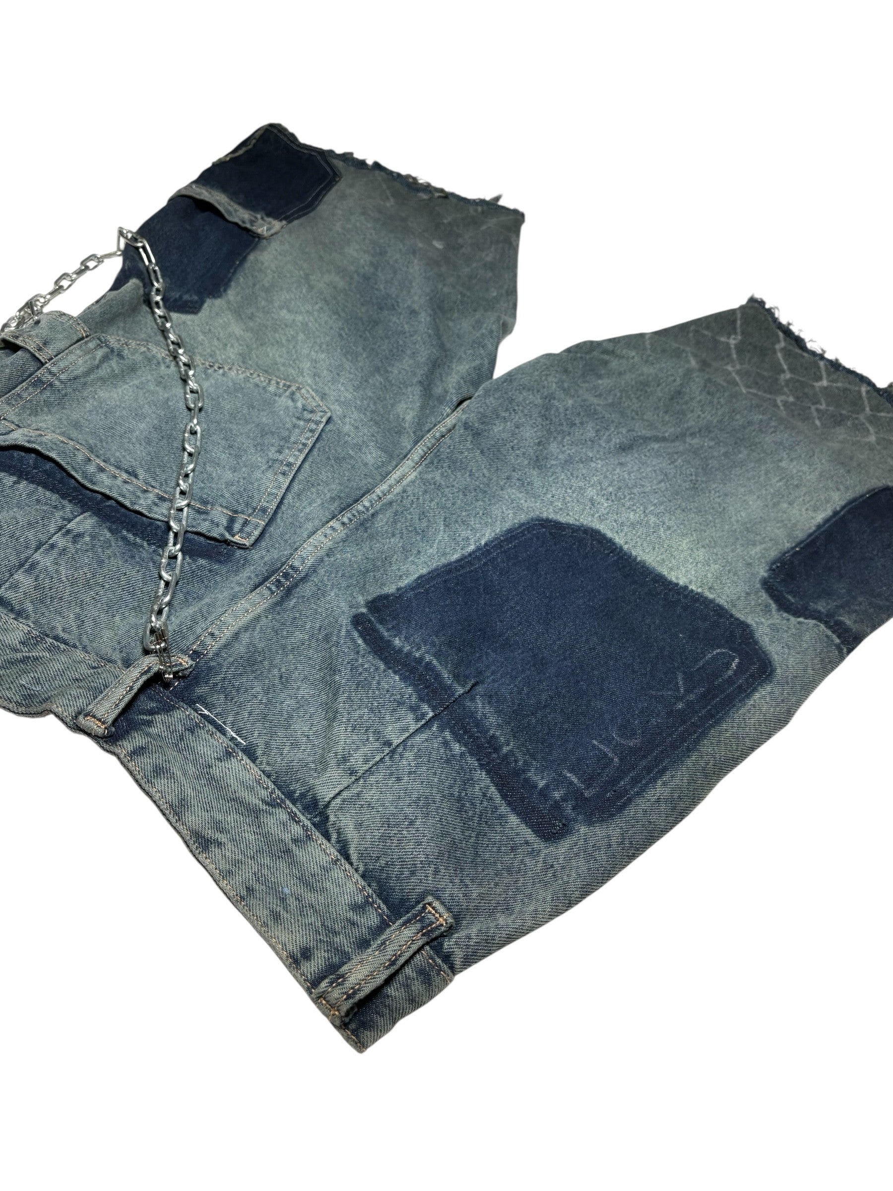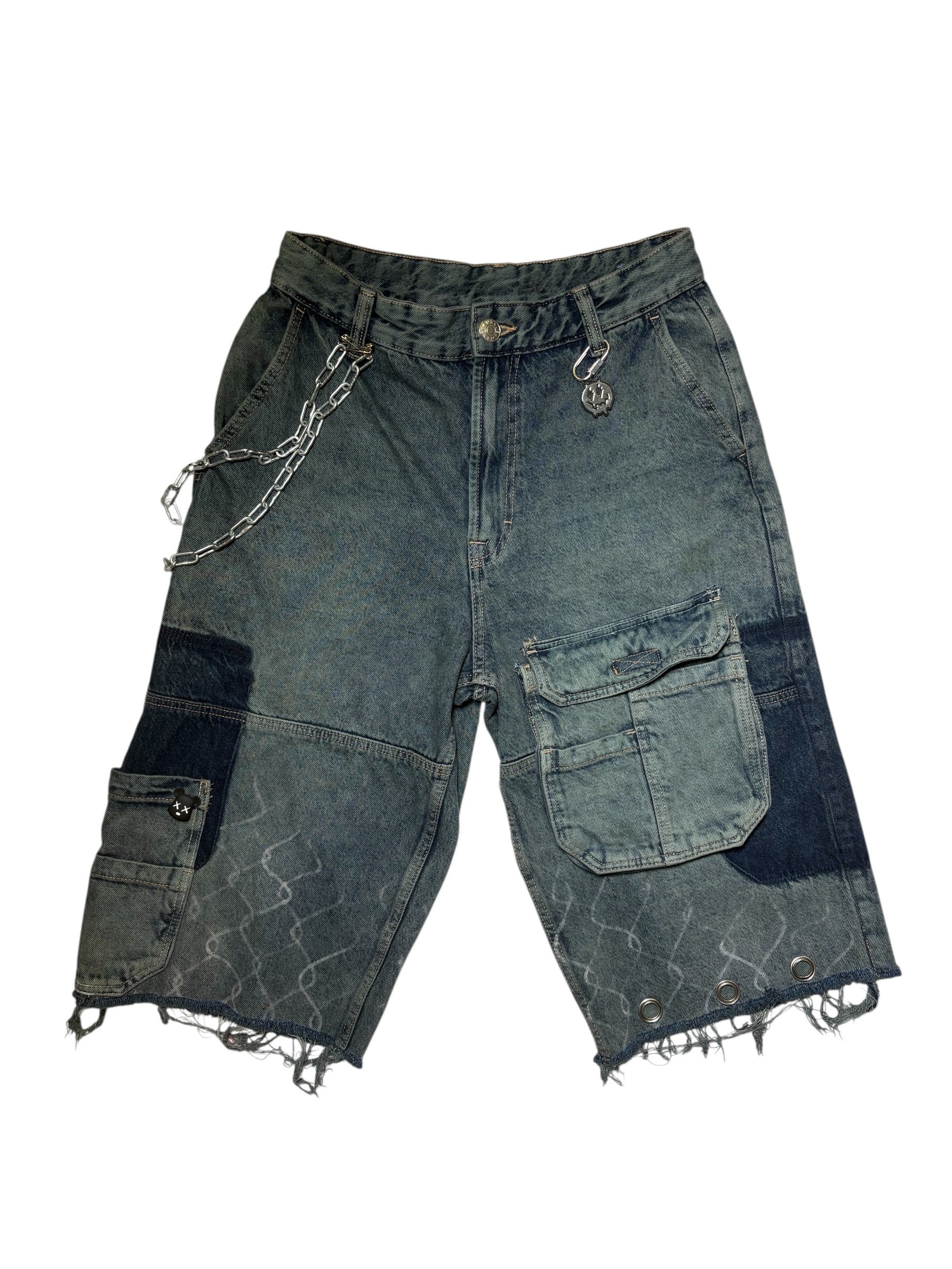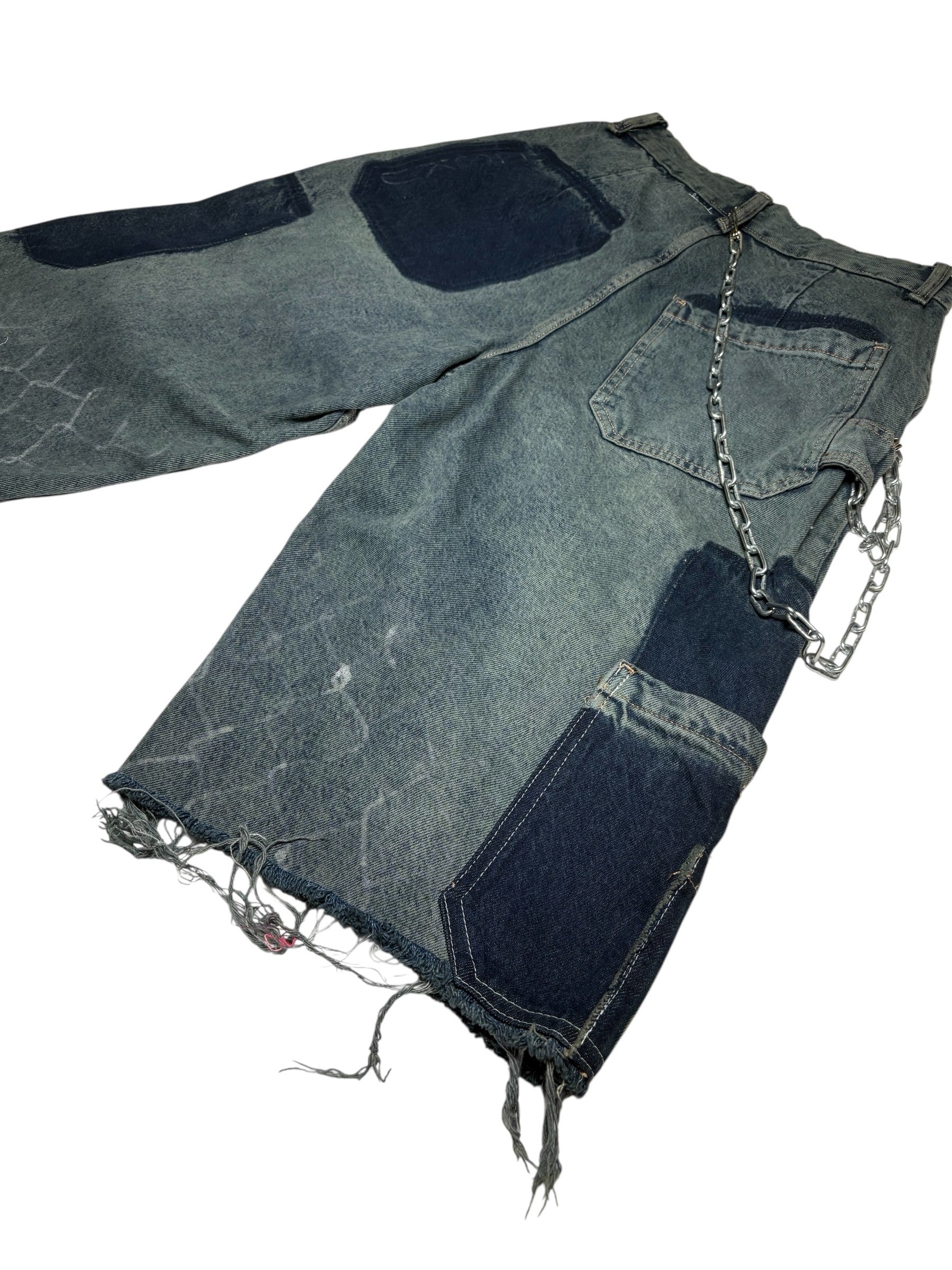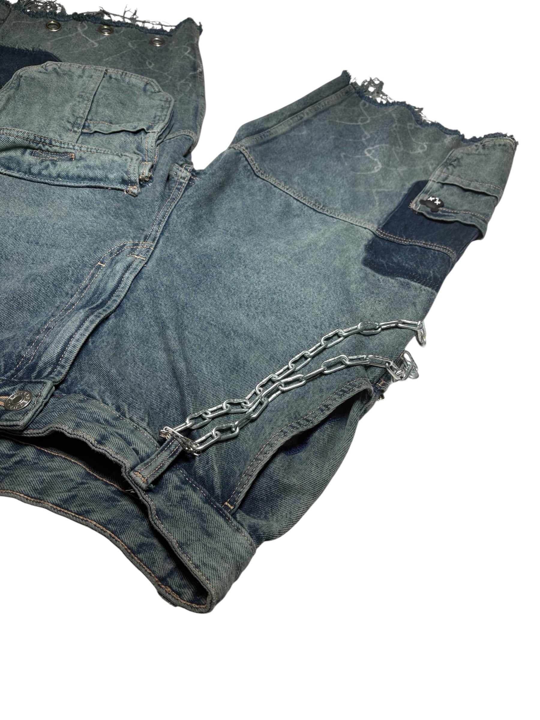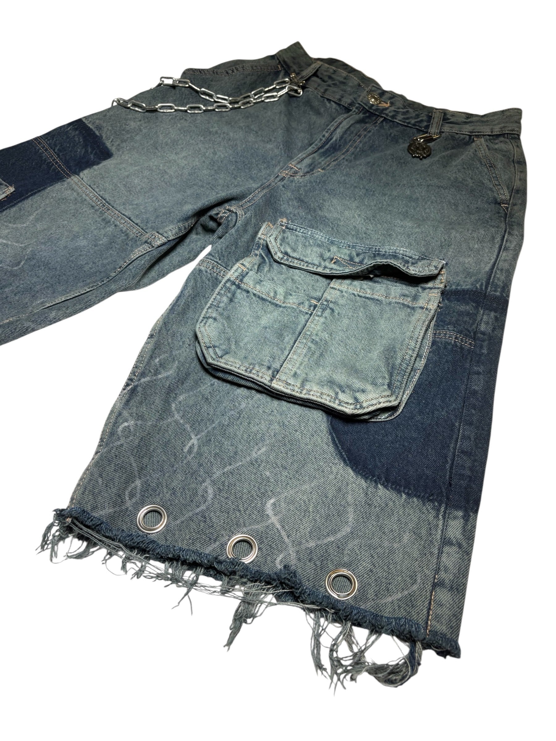 Bermuda second-hand avec dessin a la main, chaines de fer, accessoires, poches cousues et plus.