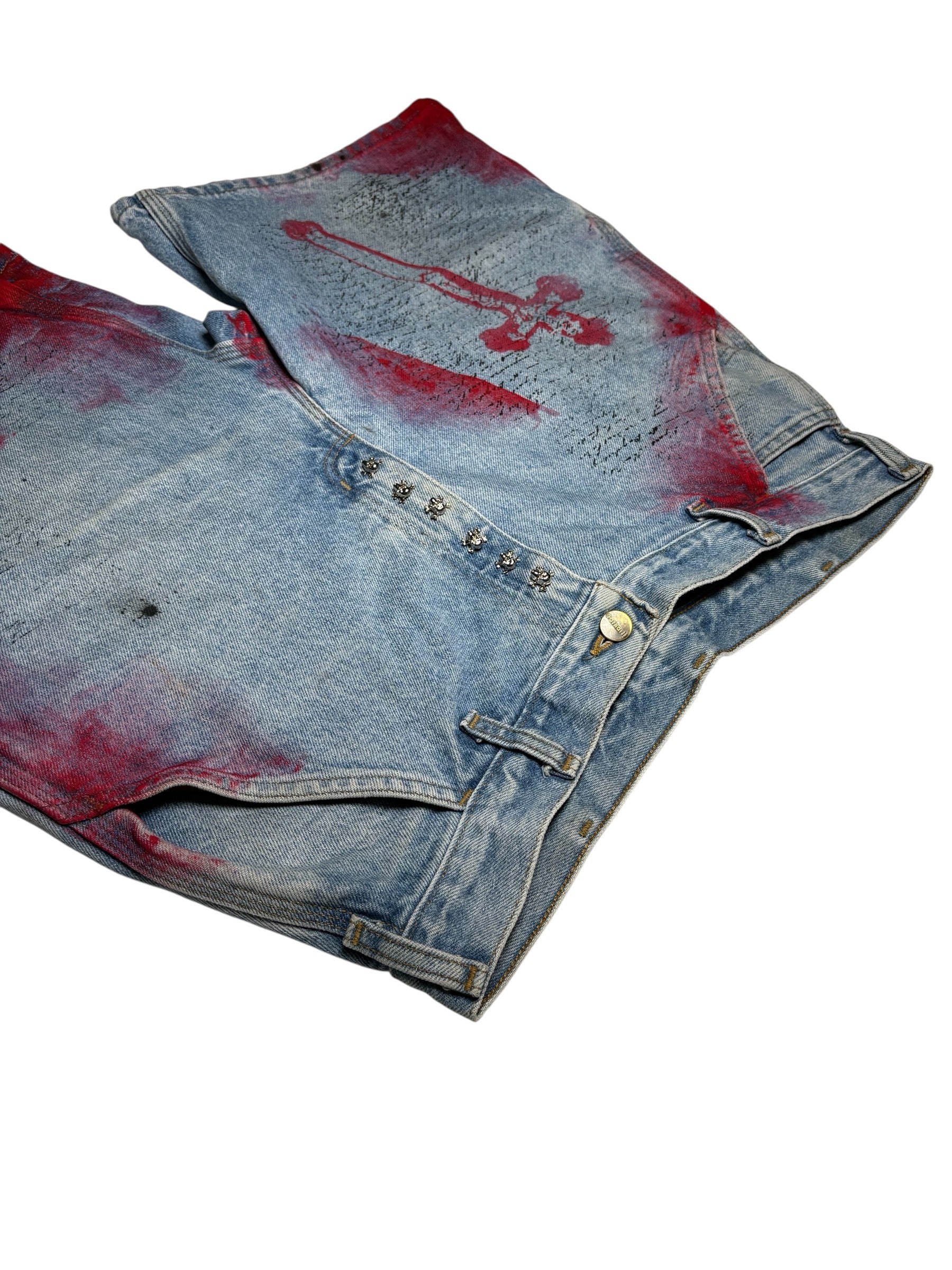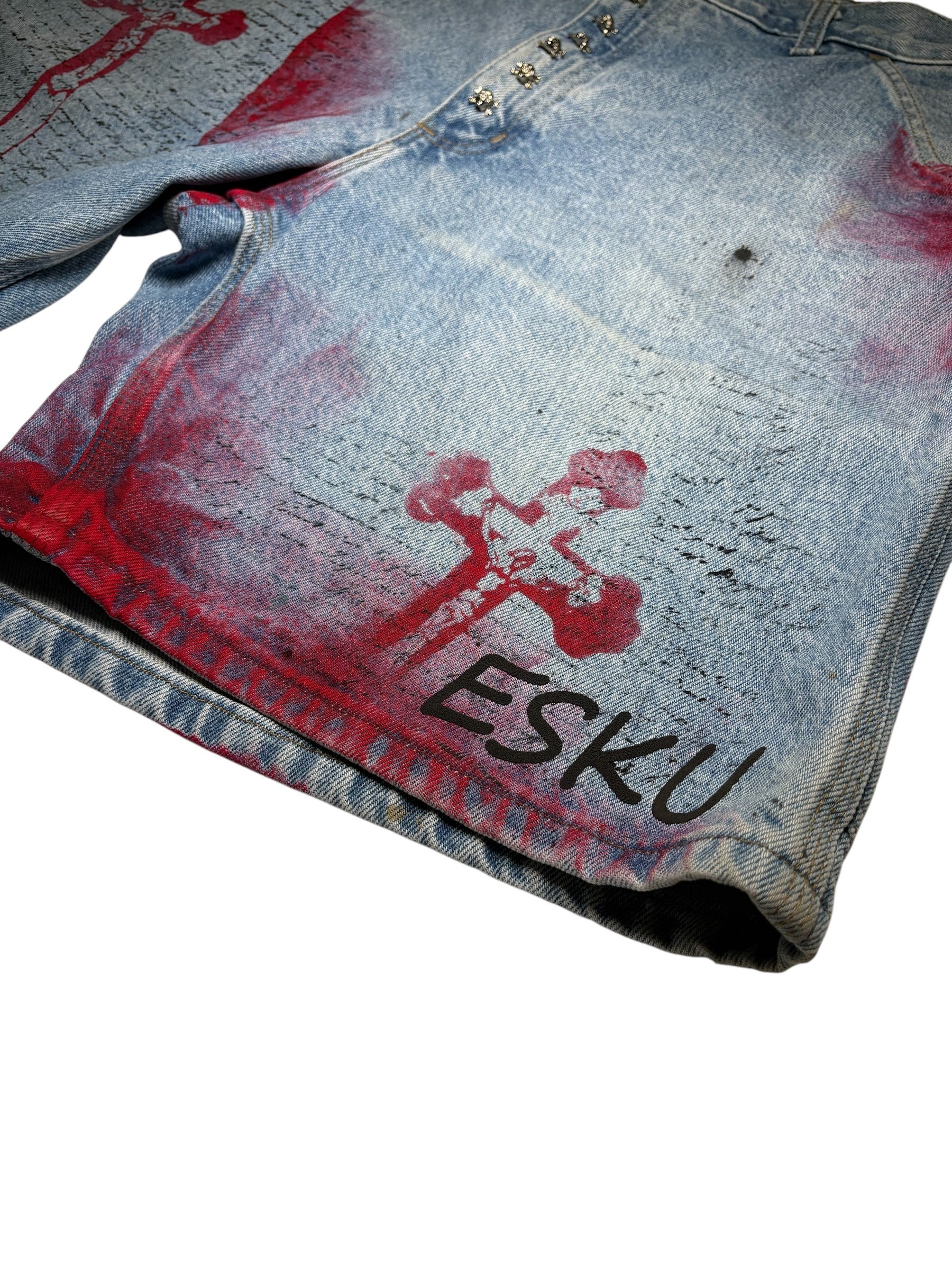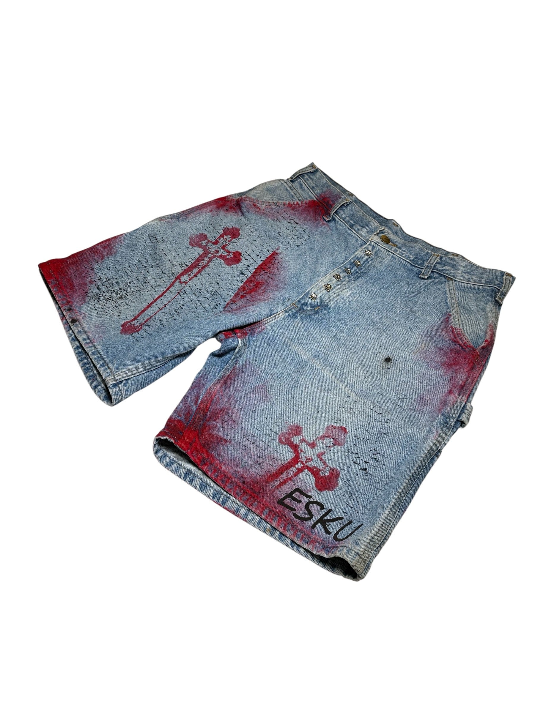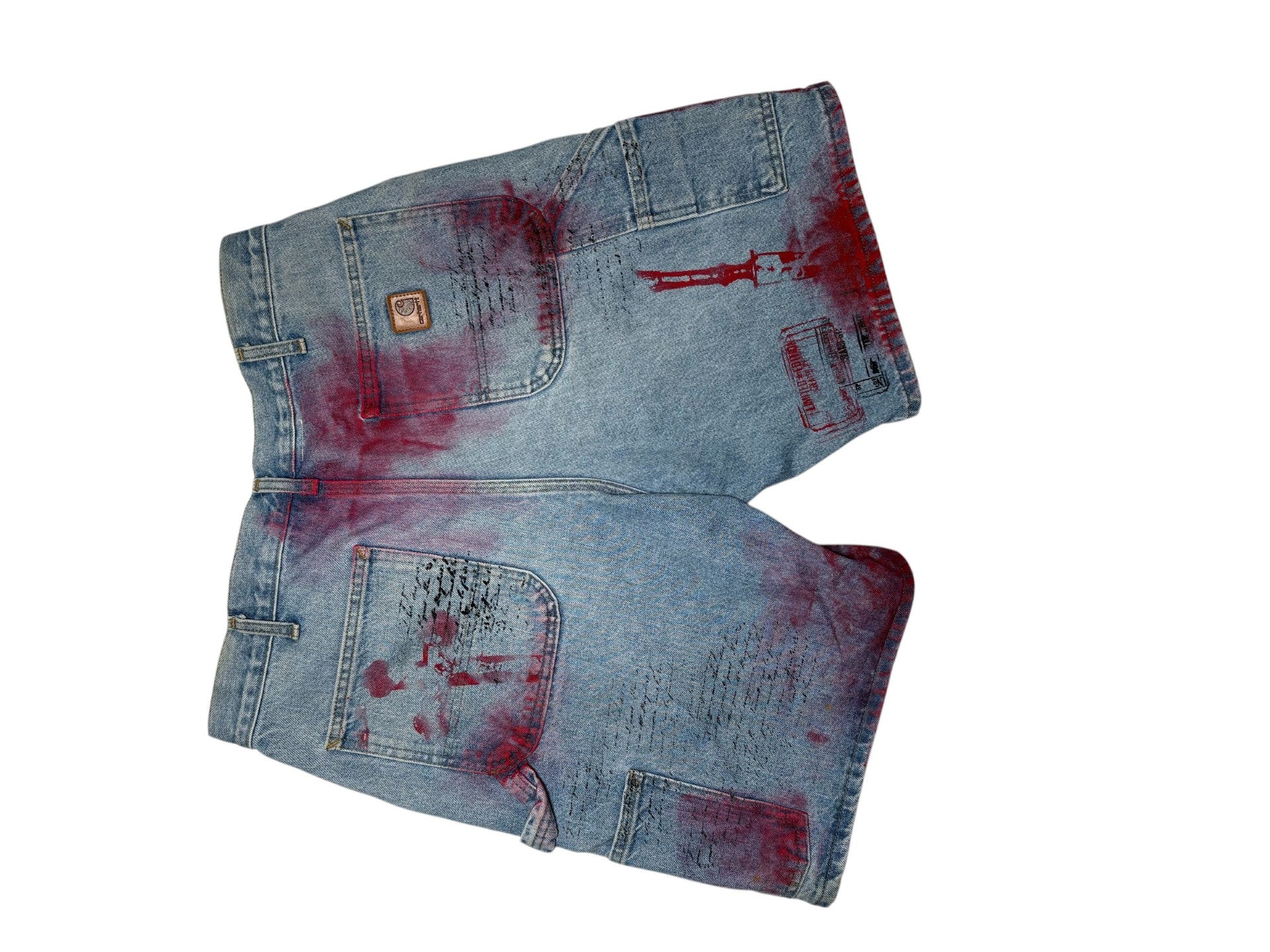 Bermuda Vintage Carhartt avec serigraphie, clous, impression DTF, dessin a la mainet plus.