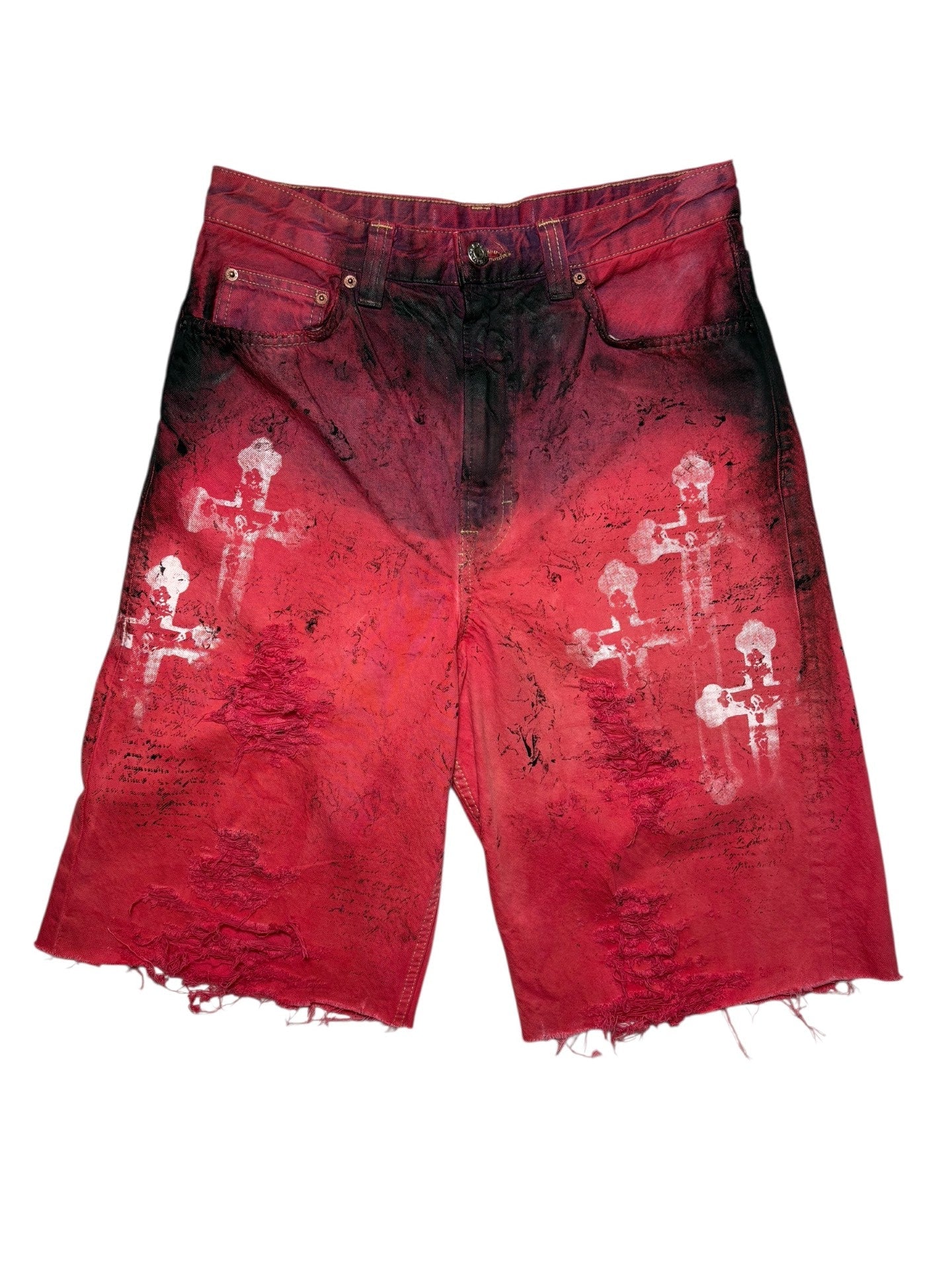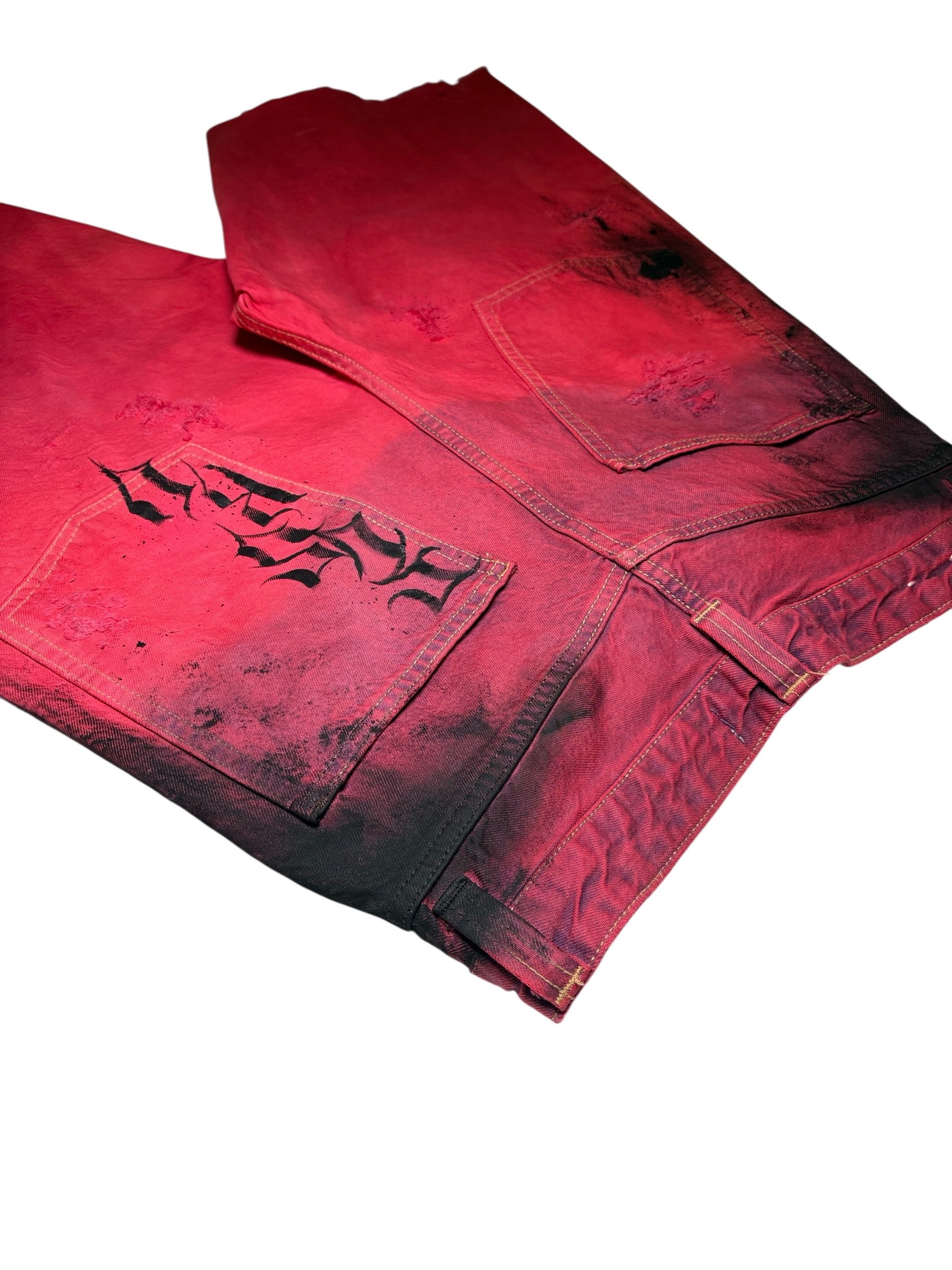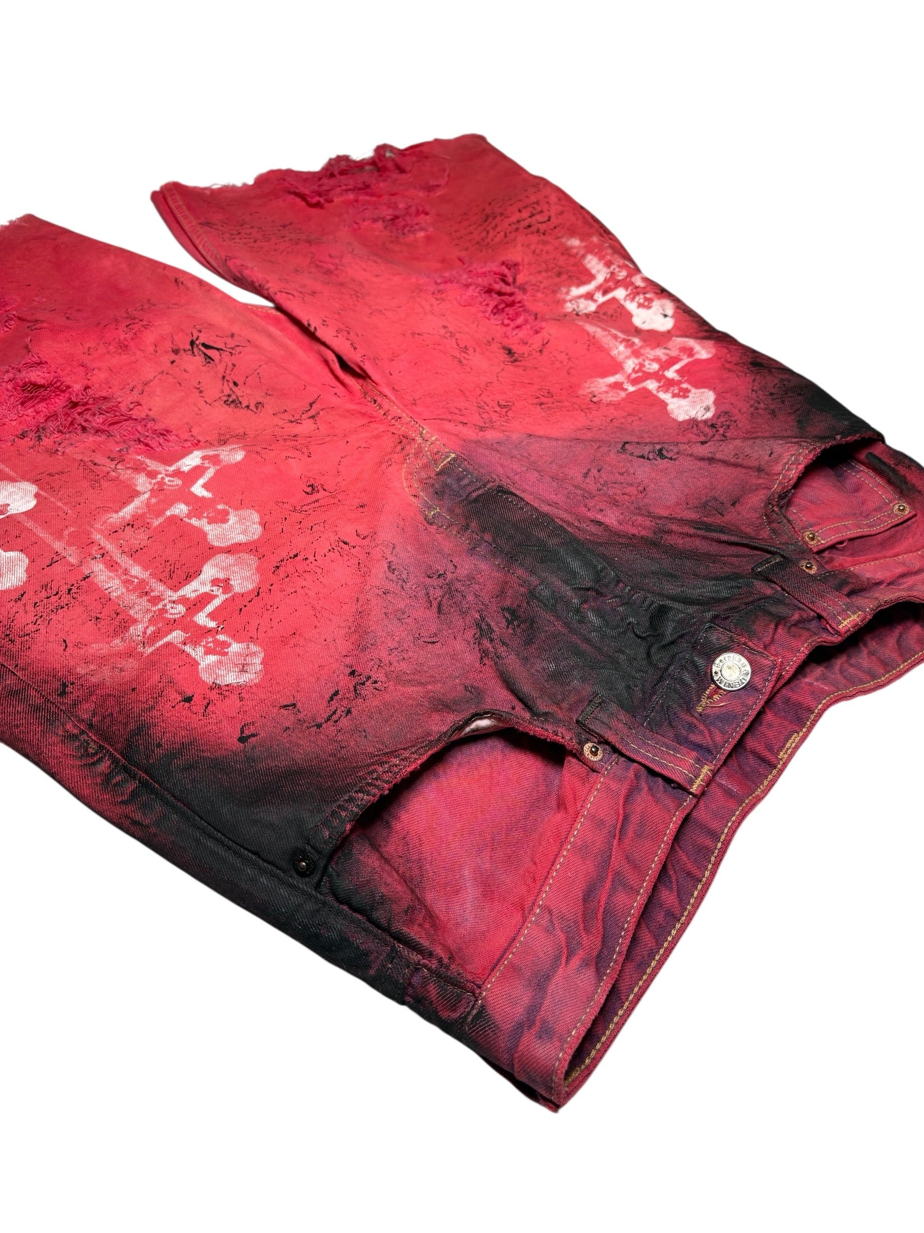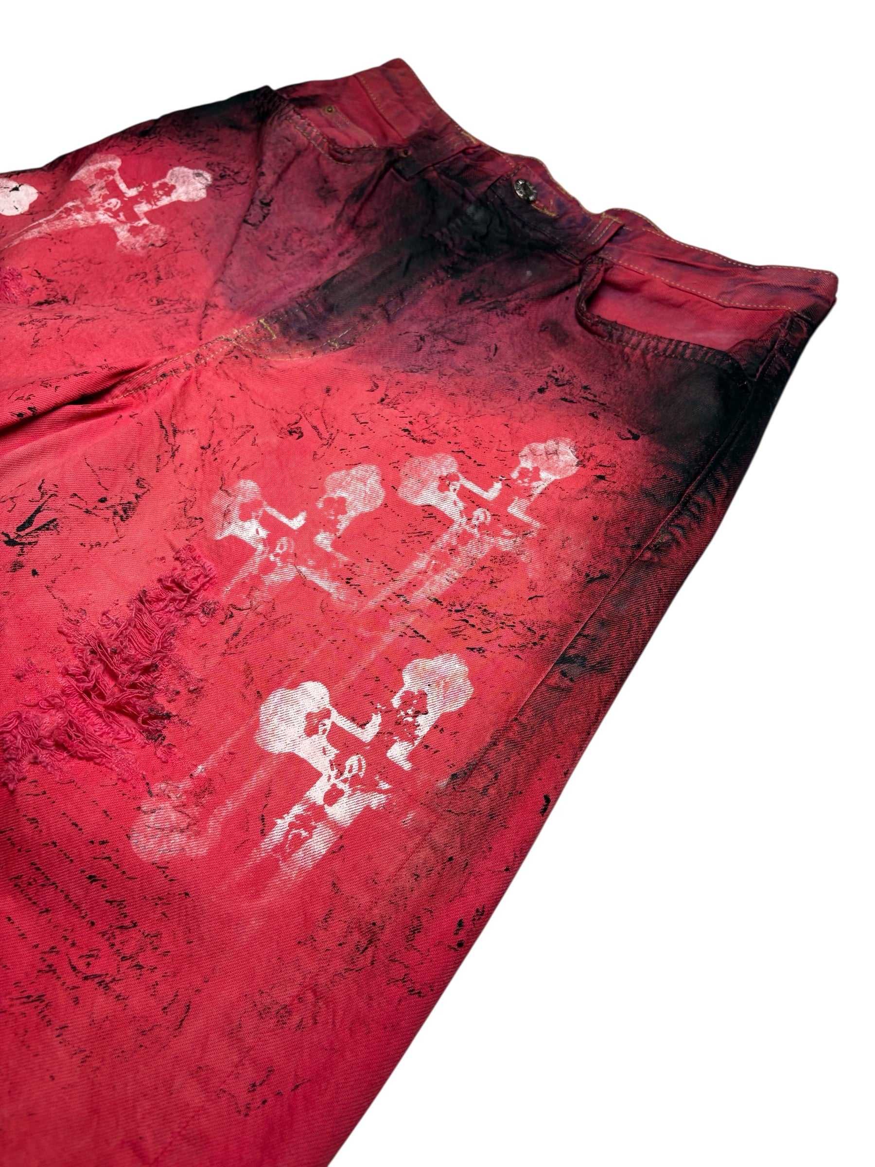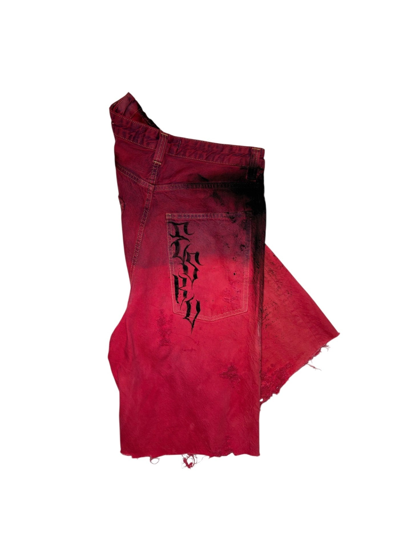 Bermuda second-hand teint rouge et decoloré avec dessin a la main, serigraphie, tissu dechiré et plus.