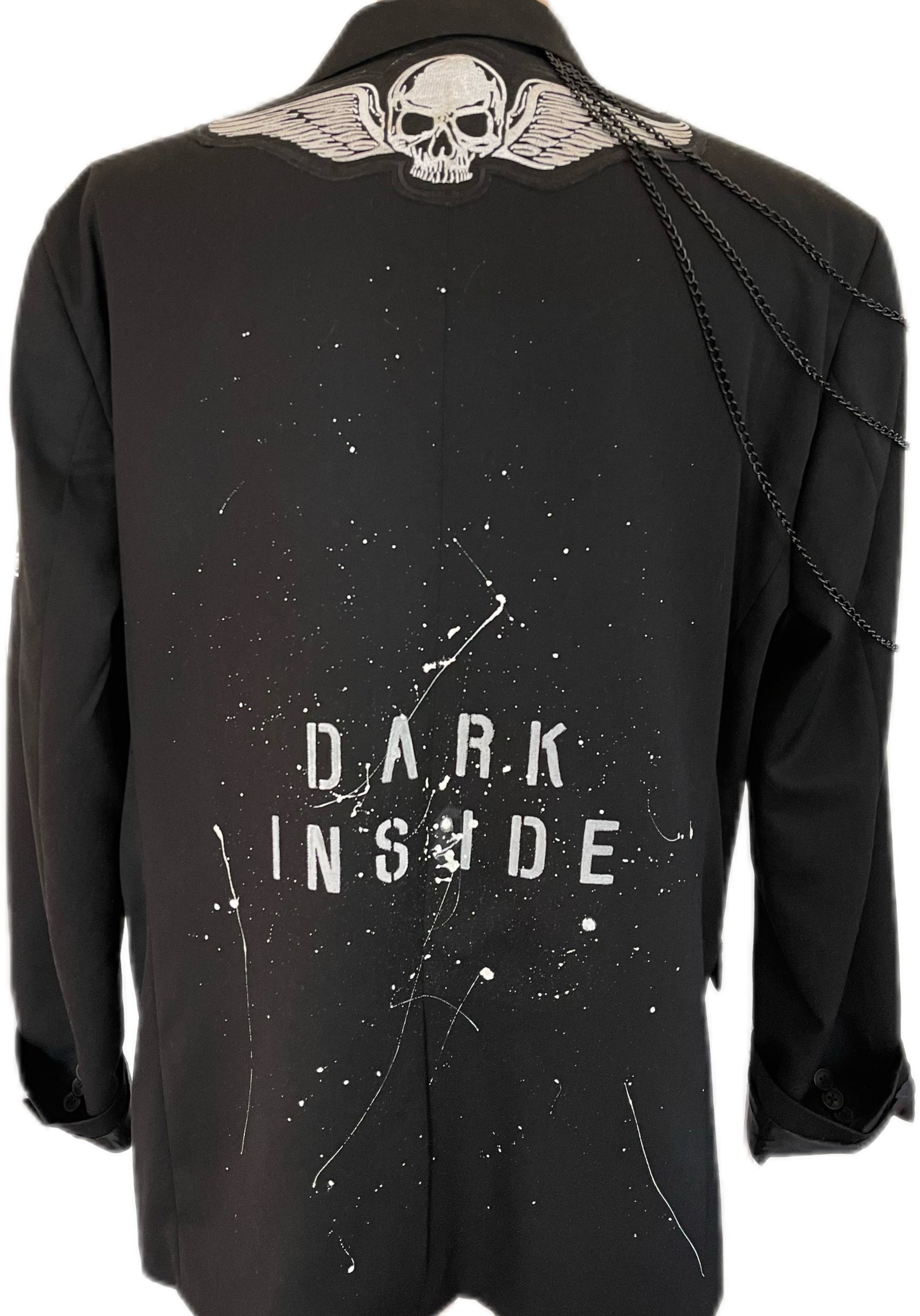 Blazer second-hand avec dessins a la main, clous, accessoires, patchs et plus.