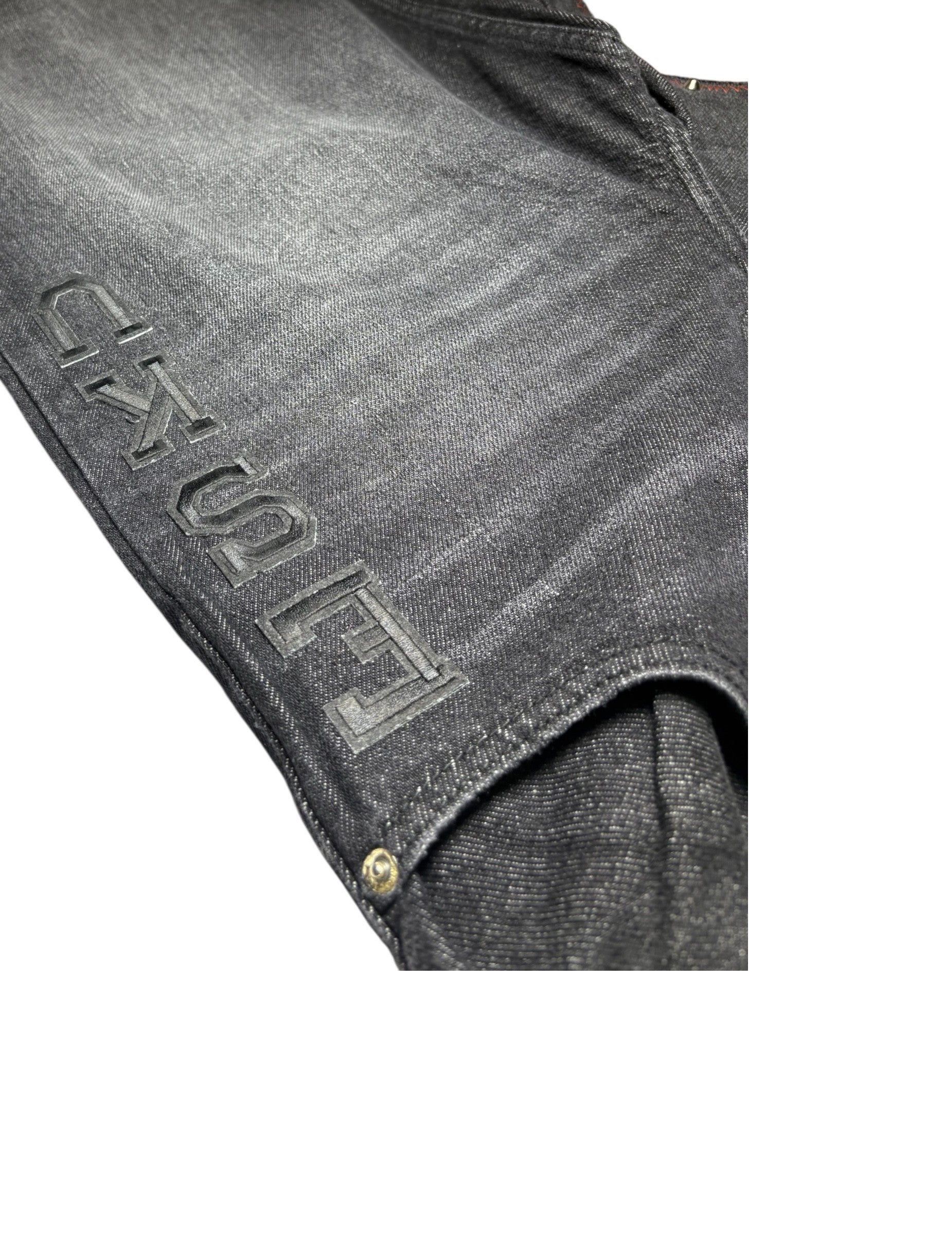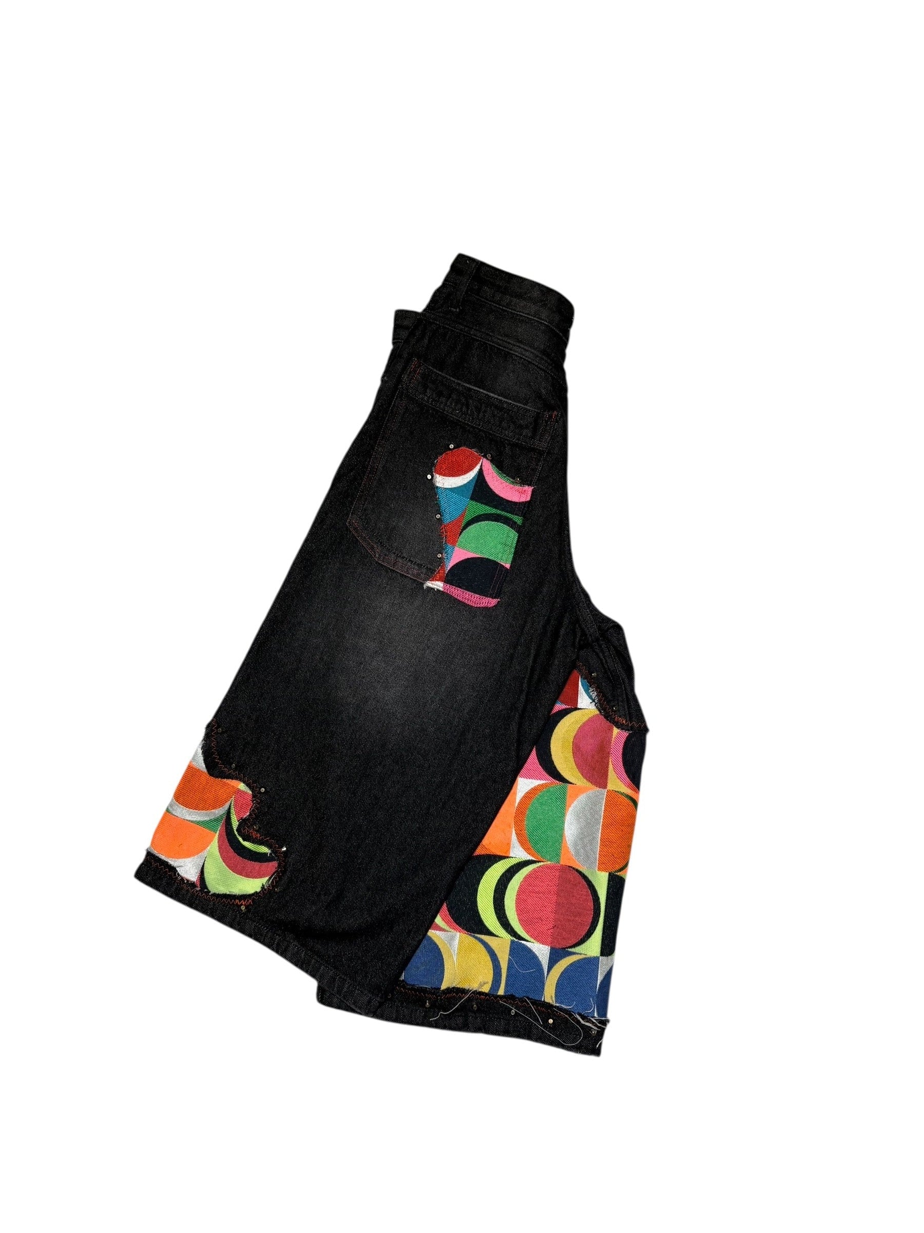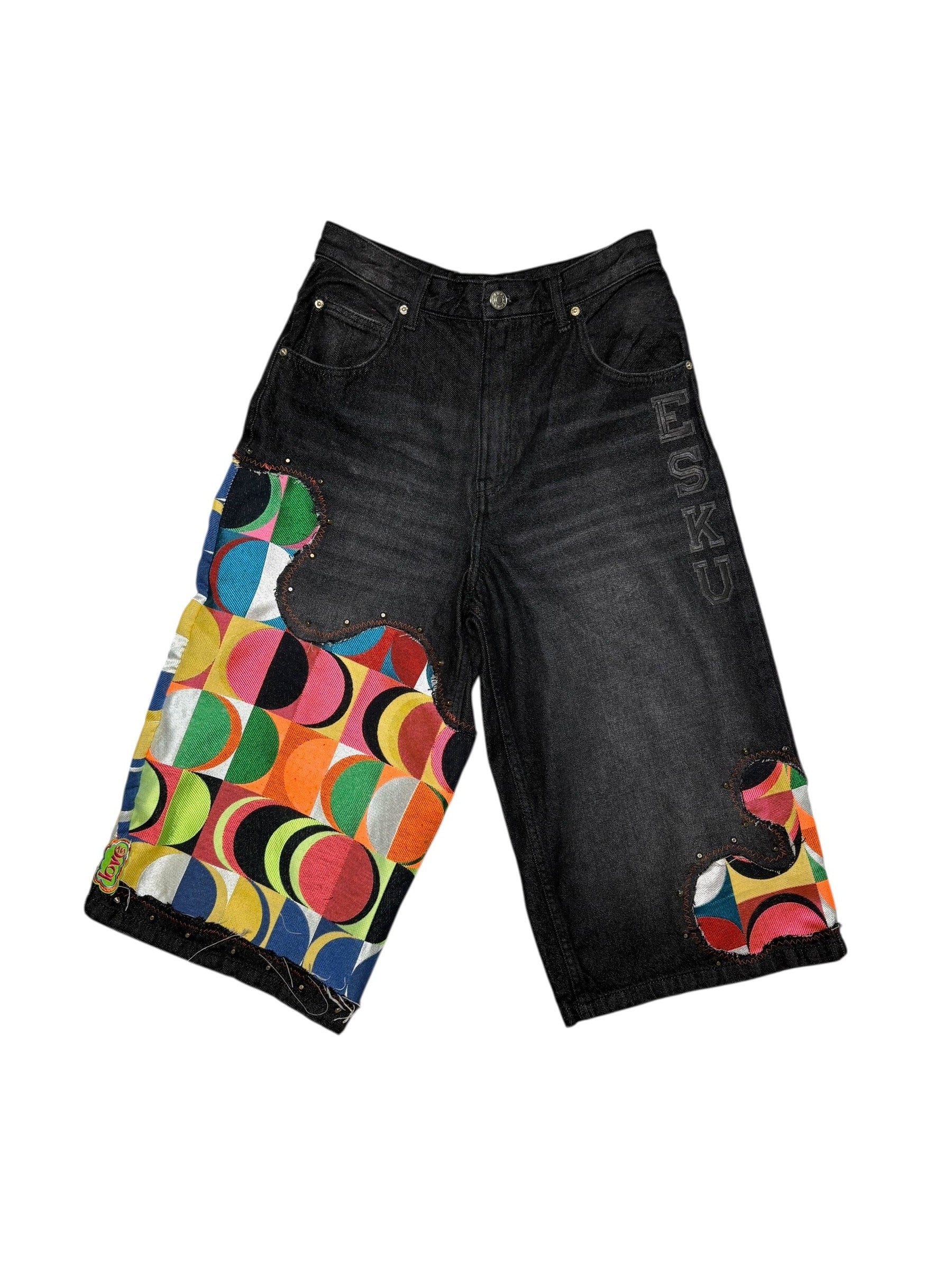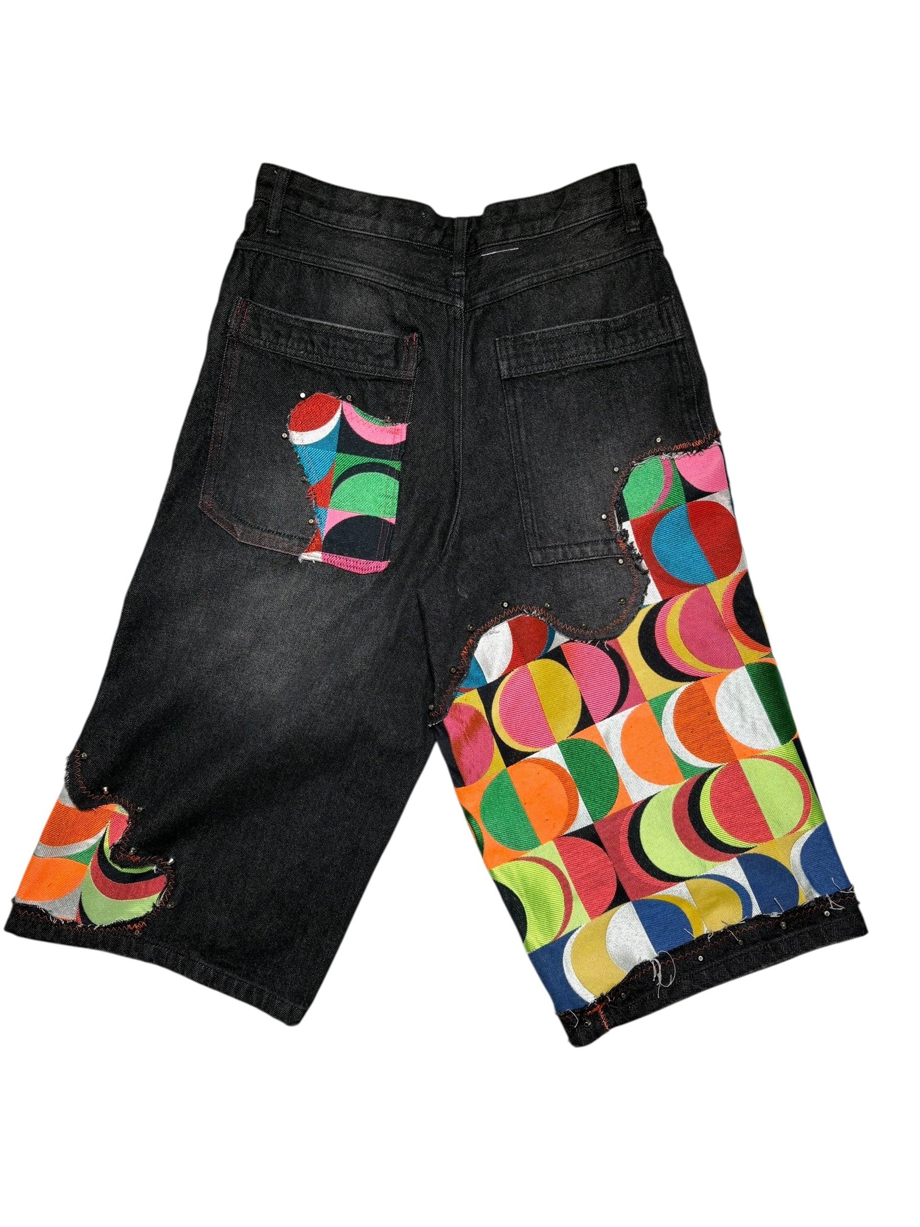 Pantacourt second-hand avec tissu cousu, clous, patch et plus.