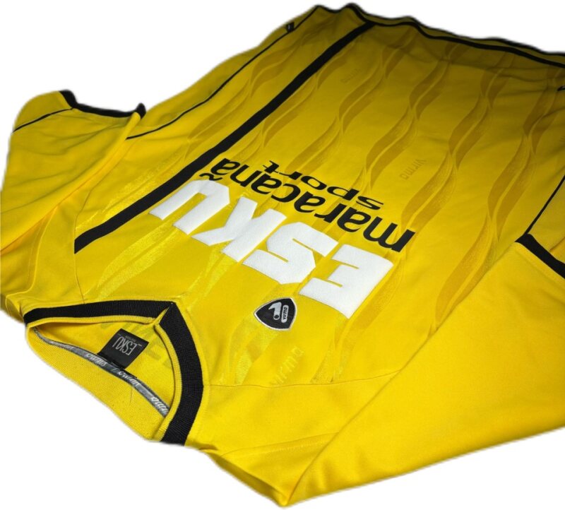 T-shirt football second-hand avec impression DTF, coupe revisitée et plus.