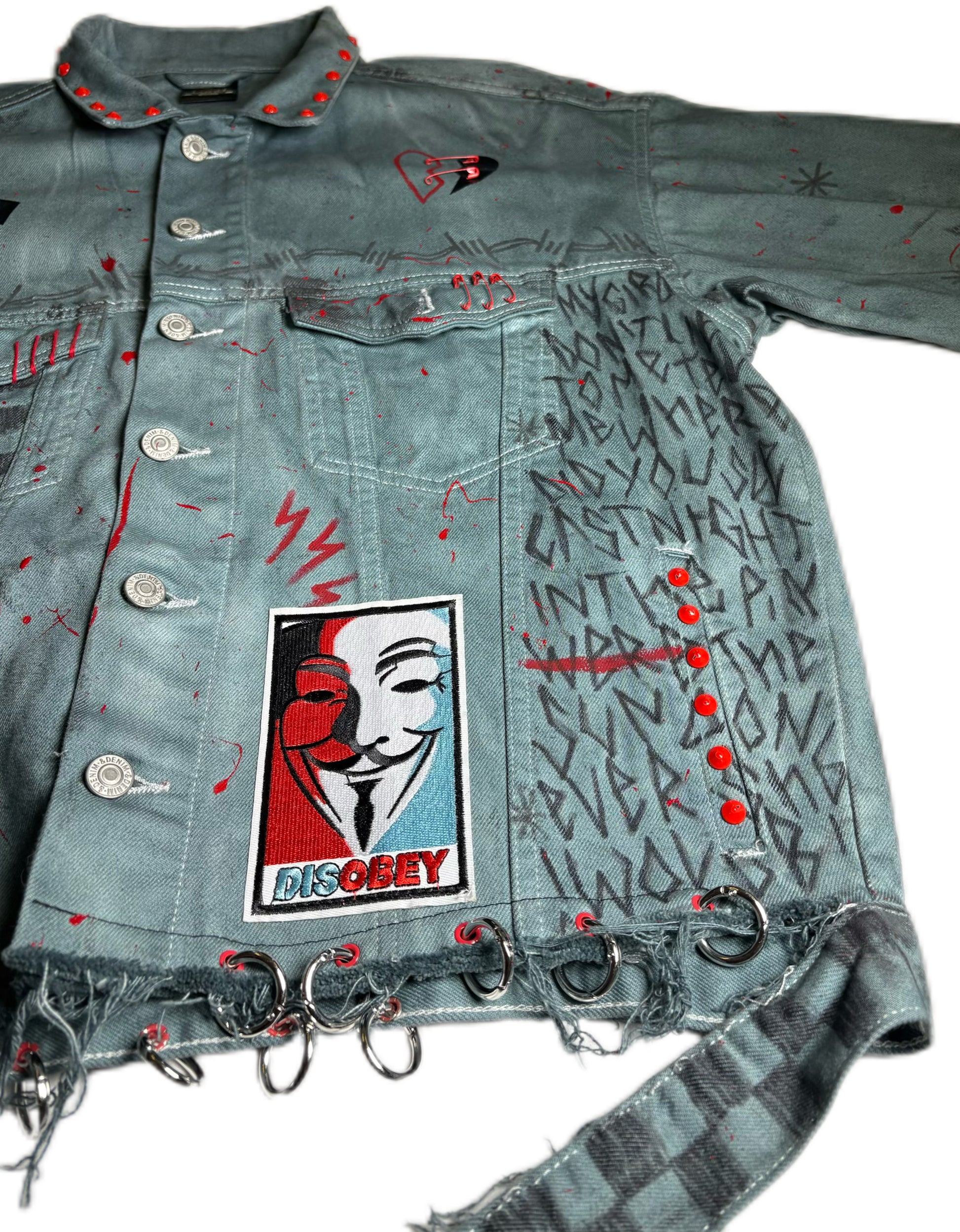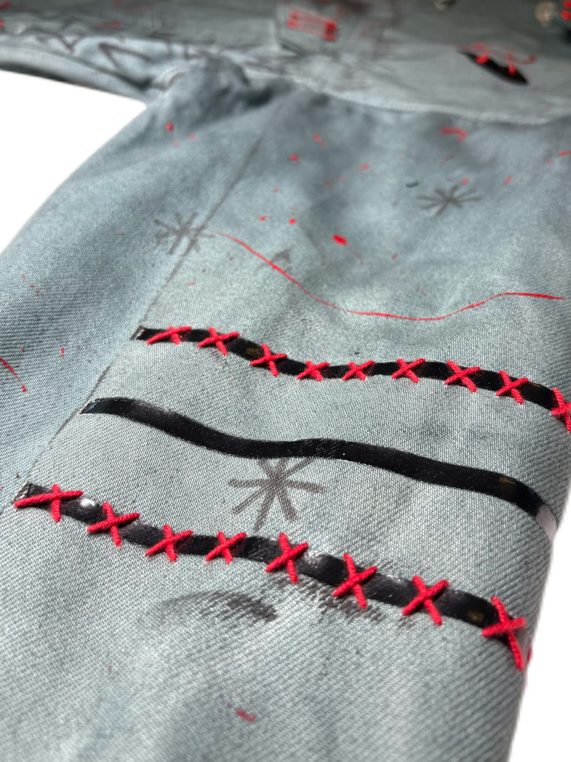 Veste second-hand teint en noir (couleur 100% naturelle) avec impression DTF, patchs, clous, dessins à la main, fil cousu a la main, rondelles à oeillets, mousquetons et plus.