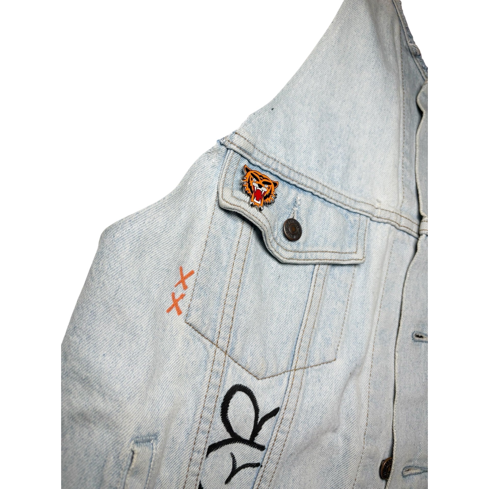 Veste Vintage Levi’s sans manches avec t-shirt Vintage Basketball cousu derrière, dessin a la main, pin’s et plus.